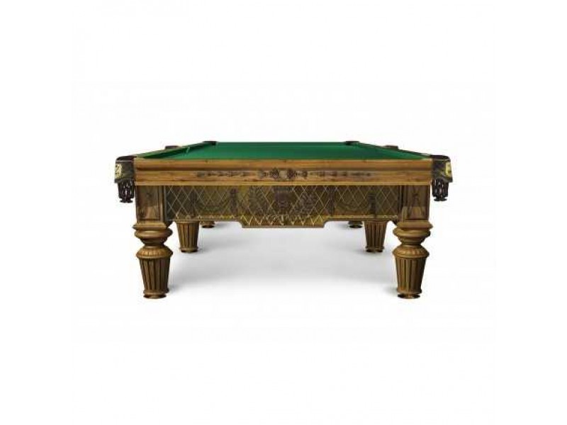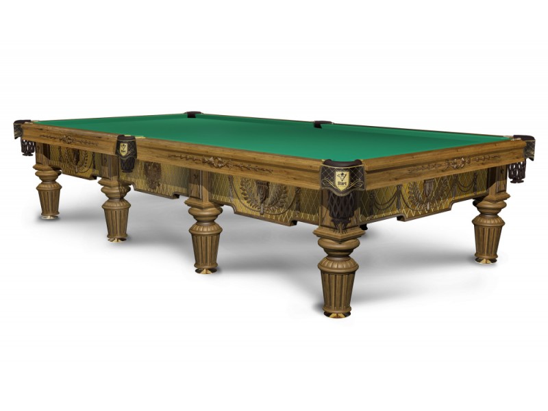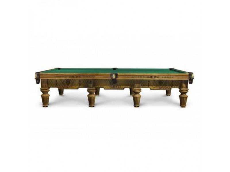 Бильярд с ручной резьбой на лафете изготовлен из отборного массива ясеня, в основание встроена эксклюзивная металлическая рама, придающая конструкции бильярда непревзойденную устойчивость. Сложная выкраска и тонирование включает слой покрытия смолой, поэтому поверхность имеет своеобразный 3D эффект.